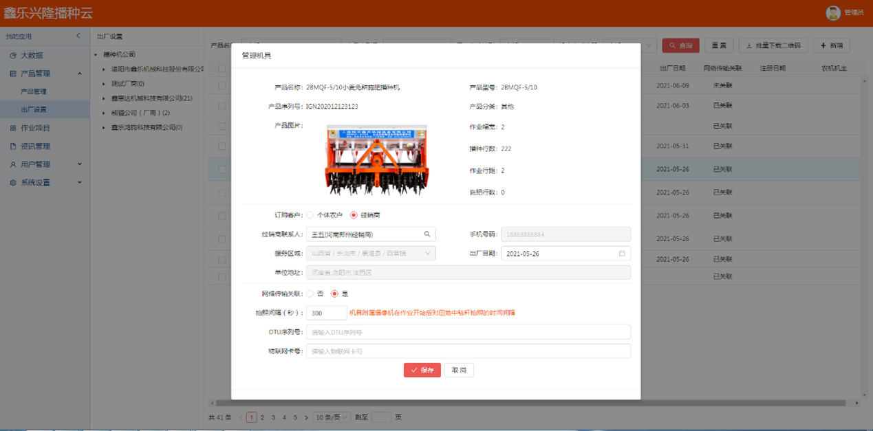 - 作業(yè)項目:為播種機(jī)(農(nóng)機(jī))生產(chǎn)廠家和播種機(jī)(農(nóng)機(jī))經(jīng)銷商提供作業(yè)項目跟蹤服務(wù)的功能。