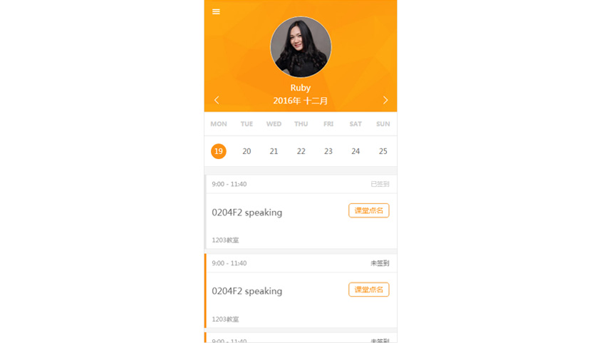 - 個人首頁: 按周查看個人課程信息及簽到記錄、課堂點名(僅老師端)