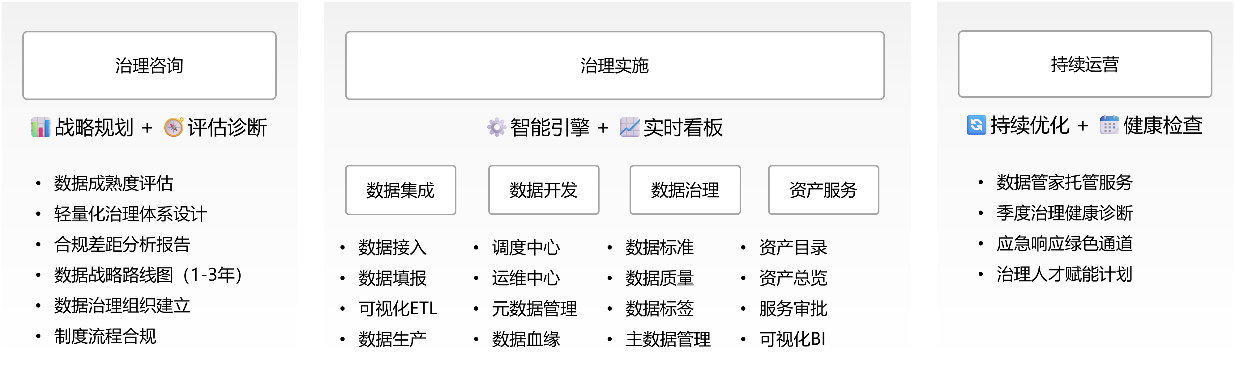 數(shù)據(jù)治理服務(wù)流程圖“樞理”從戰(zhàn)略高度出發(fā),開展數(shù)據(jù)治理咨詢。通過數(shù)據(jù)成熟度評(píng)估,精準(zhǔn)診斷企業(yè)數(shù)據(jù)管理現(xiàn)狀;設(shè)計(jì)輕量化治理體系,適配企業(yè)規(guī)模與業(yè)務(wù)特性;出具合規(guī)差距分析報(bào)告,保障數(shù)據(jù)管理符合行業(yè)規(guī)范。同時(shí),繪制1 - 3年數(shù)據(jù)戰(zhàn)略路線圖,明確長(zhǎng)期治理方向;協(xié)助建立數(shù)據(jù)治理組織,厘清職責(zé)分工;規(guī)范制度流程,讓數(shù)據(jù)治理“有章可循”,為后續(xù)治理筑牢頂層設(shè)計(jì)基礎(chǔ) 。